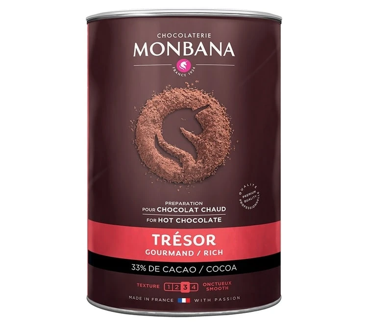 Trésor au chocolat est un chocolat en poudre de la marque Monbana permettant de réaliser un chocolat chaud mousseux et onctueux.