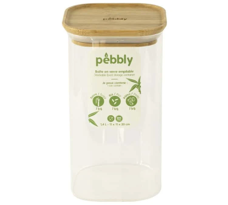 La boîte carrée Pebbly 100% hermétique en verre saura mettre en valeur votre cuisine. Sa contenance de 1.4L ainsi que son couvercle en bambou la rend indispensable. Composée de verre Borosilicate, elle sera plus solide et son couvercle plat à rebord, vous permettra de les empiler pour gagner en place.
