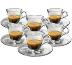 Lot de 6 tasses expresso (5cl) et sous-tasses en verre de la marque italienne Caffè Vergnano. Ces tasses expresso Vergnano allient modernité et qualité haut-de-gamme . Passe au lave-vaisselle.