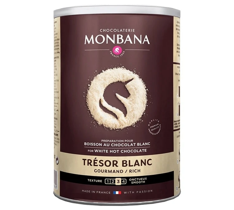 Découvrez ce délicieux Trésor au chocolat blanc est un chocolat en poudre de la marque Monbana permettant de réaliser un chocolat chaud mousseux saveur chocolat blanc.