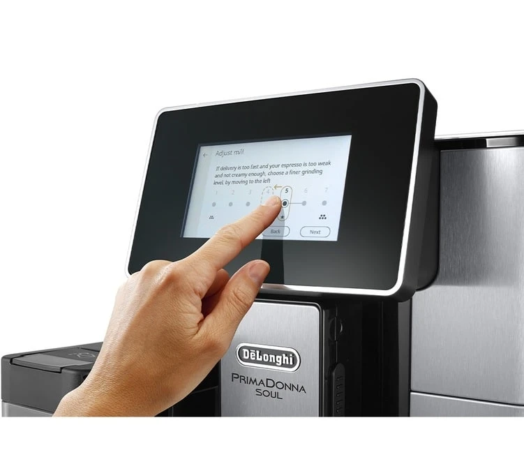 Cet expresso broyeur DeLonghi Primadonna ECAM 610.74.MB est équipé d’un large écran tactile TFT couleur de 4,3″. Il permet de prendre en main très facilement votre expresso broyeur. Vous pouvez accéder directement à toutes les recettes en les faisant défiler sur la page d’accueil de l’écran. De plus vous pouvez également personnaliser chacune des recettes en accès direct.